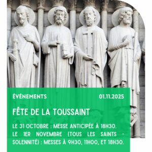 - le week-end : samedi messe anticipée à 18h30 / dimanche : messes à 9h30, 11h00, 17h30 et 19h30